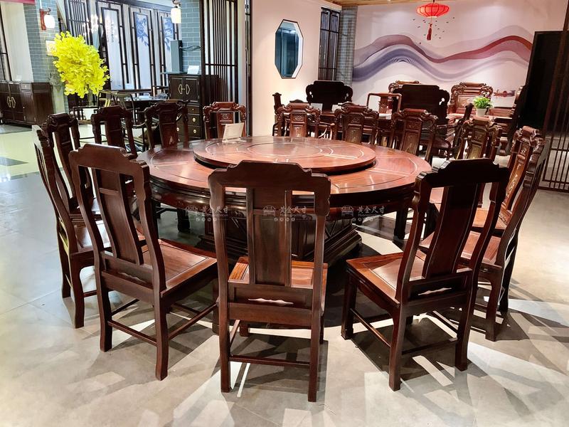 2米素面圆台1张,转盘1个,檀雕吉象餐椅14张