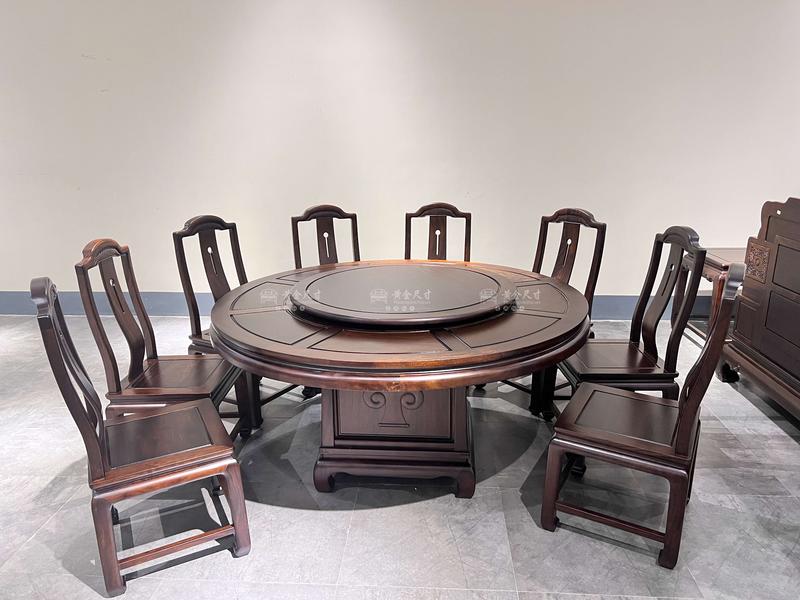 福檀圆台1.58米+10张福星餐椅 东南亚黑酸枝