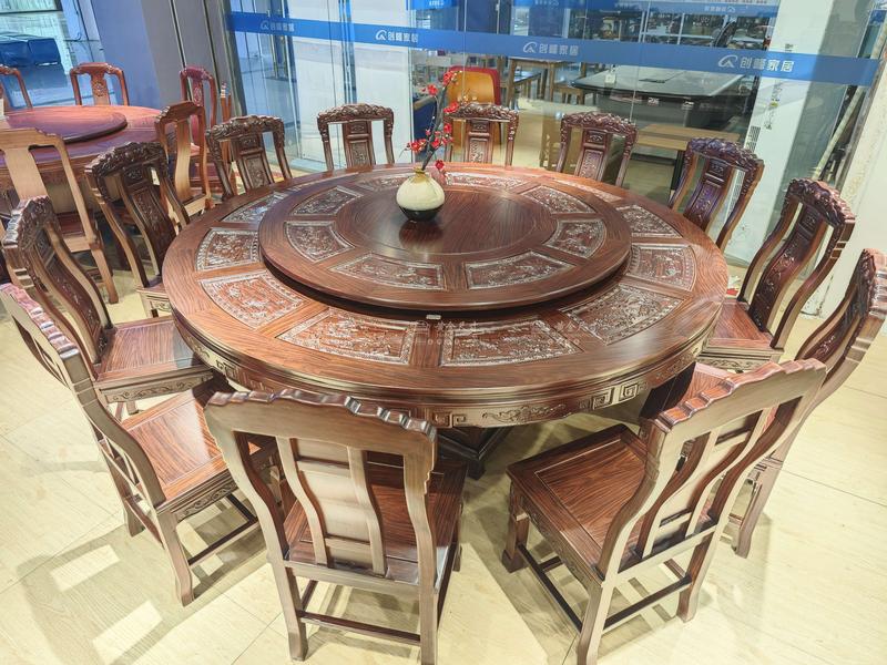 2.2米电动雕花圆台1张;12张花开富贵餐椅